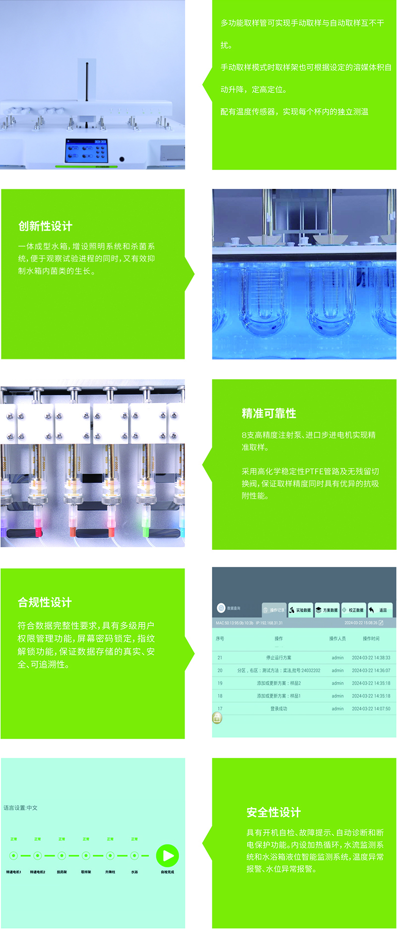 ● 采用8支高精度注射泵,可自动完成过滤、取样、补液及稀释